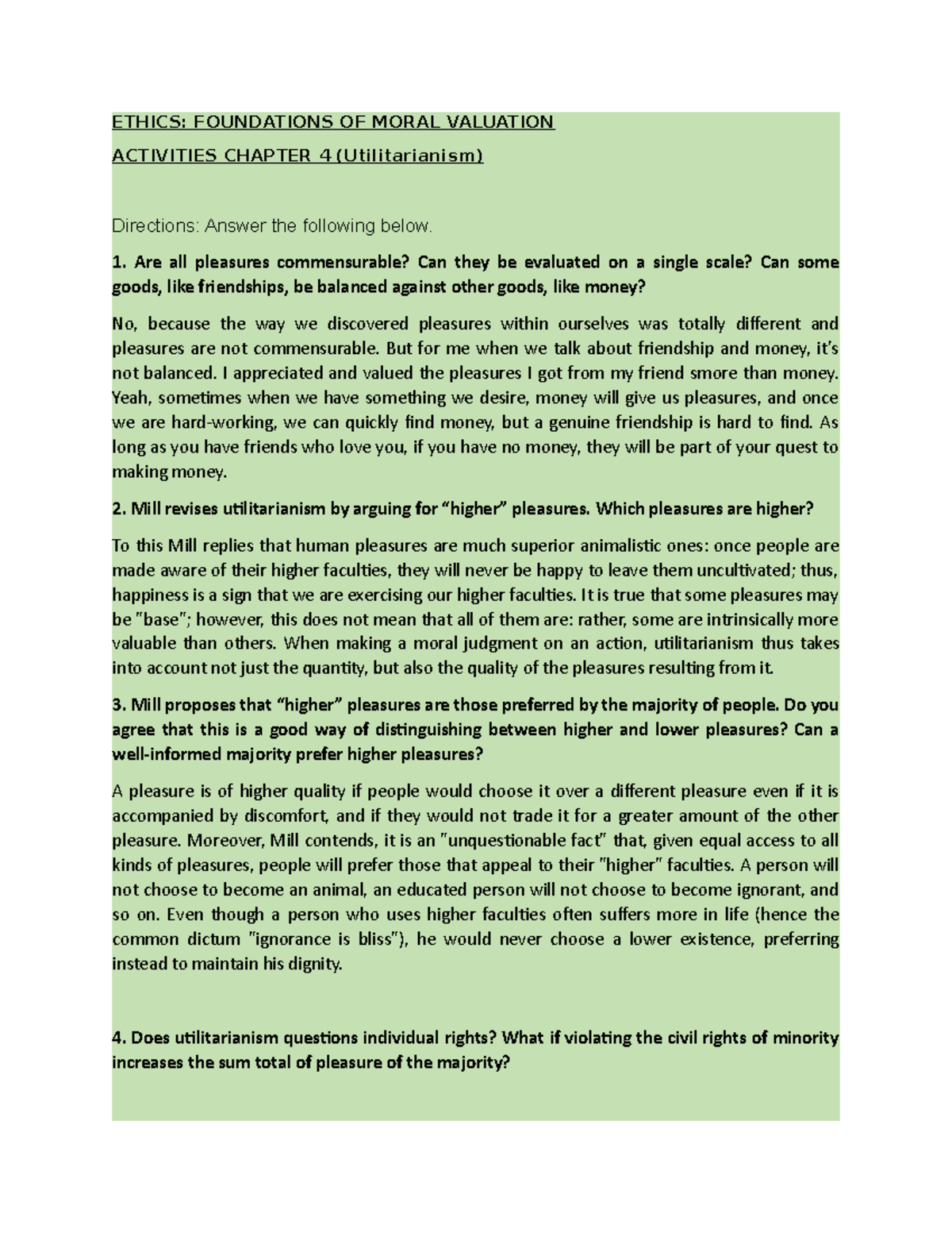 Olval 02 Activity 4 Ethics Foundations Of Moral Valuation Activities Chapter 4 Utilitarianism Studocu