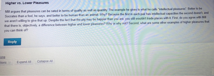 The mathematics here is hard to understand but Socrates position is a clear example of what we shall call the higherlower thesis according to which one kind of pleasure in this. More specifically higher pleasures are intellectual pleasures while lower pleasures are sensual pleasures. Mill argues that animals are not capable of experiencing higher pleasures because.